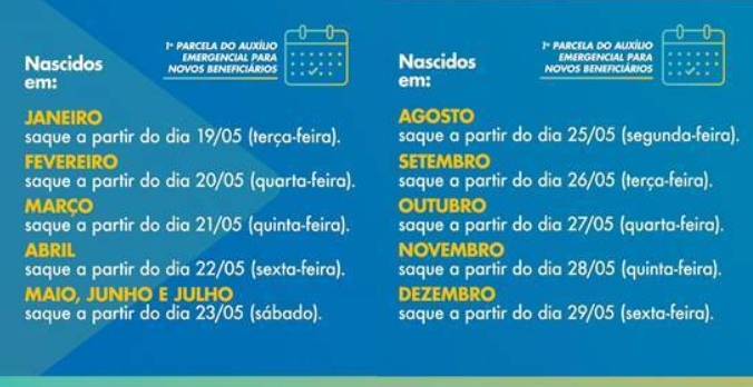 Conforme o calendário divulgado pelo Ministério da Cidadania, podem sacar a partir de sábado 2,1 milhões de cidadãos nascidos entre maio e julho constantes no lote mais recente recebido da Dataprev. Confira o escalonamento:
