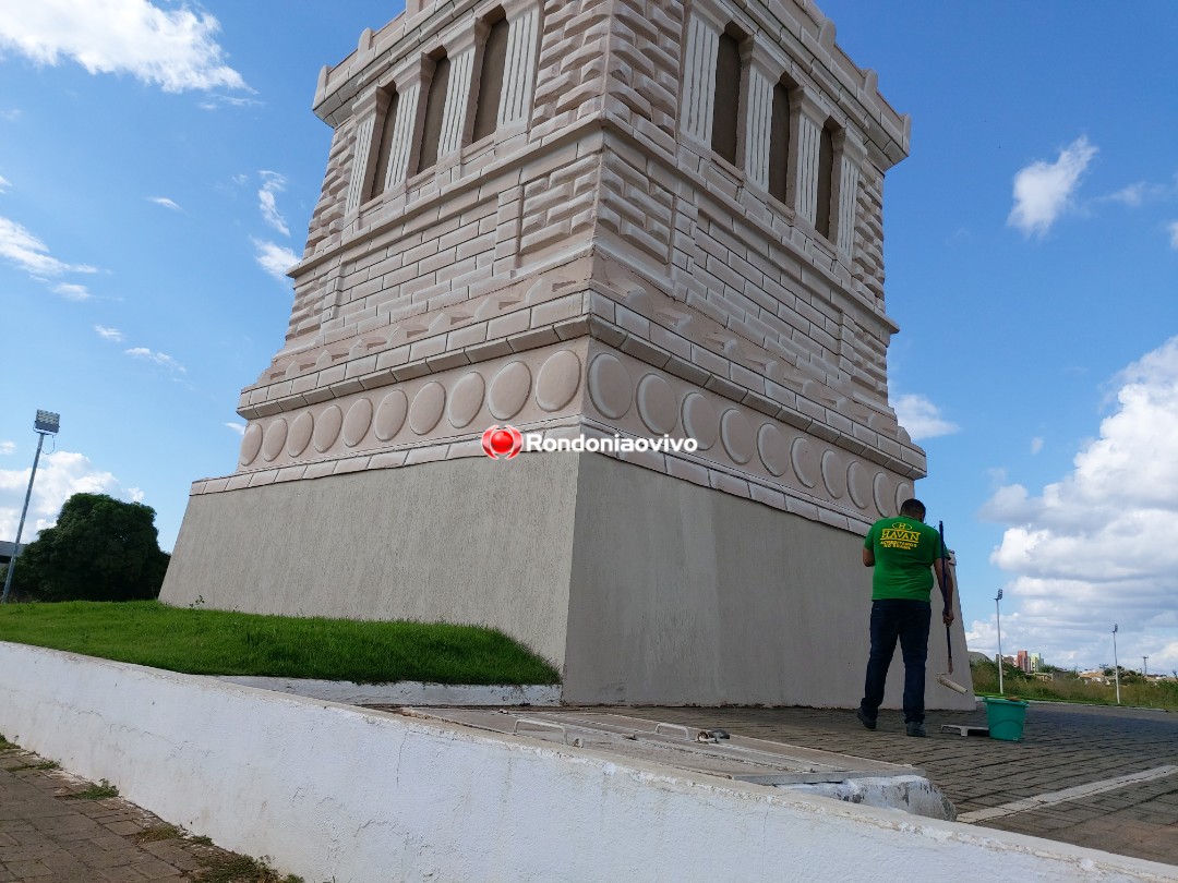 Na manhã desta quarta-feira (3) funcionários da empresa se deparam com a base da estátua pichada