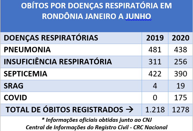 O aumento só é percebido em relação aos casos de mortes por SRAG (Síndrome Respiratória Aguda Grave), que enquadra a influenza A, dengue, vírus sincicial respiratório, adenovírus, hantavírus, chegando a 19 neste ano, enquanto em 2019 foram apenas 4. O portal registra ainda o número de mortes por covid-19 em Rondônia já somam 175.
