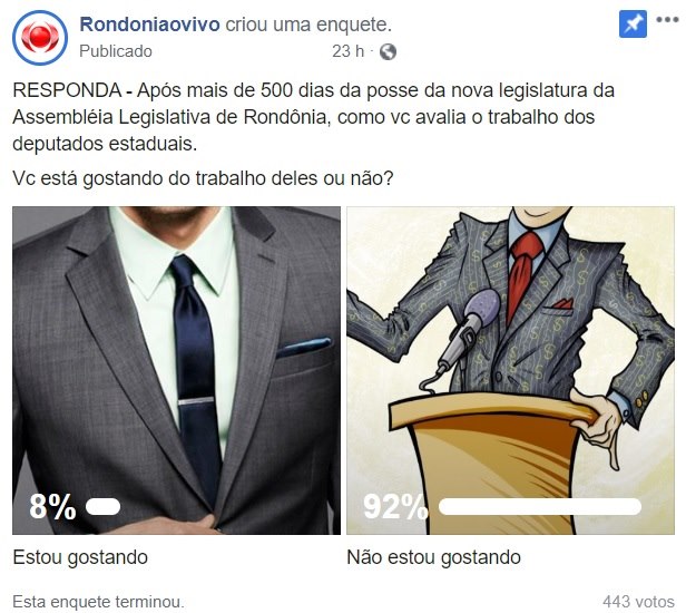 Uma enquete realizada pela nossa página do Facebook, questionou os internautas que após 500 dias da posse da nova legislatura da Assembleia Legislativa do Estado de Rondônia, como eles avaliavam o trabalho dos deputados estaduais.