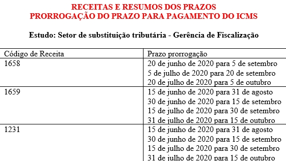 A prorrogação dos vencimentos será para empresas com atividade econômica que tiveram fechamento. Inclui empresas do MEI, Simples Nacional e Regime Normal, que tenham comprado de fora do Estado com débitos nas modalidades: ICMS Antecipado, ICMS Substituição Tributária e ICMS Diferencial de Alíquota.