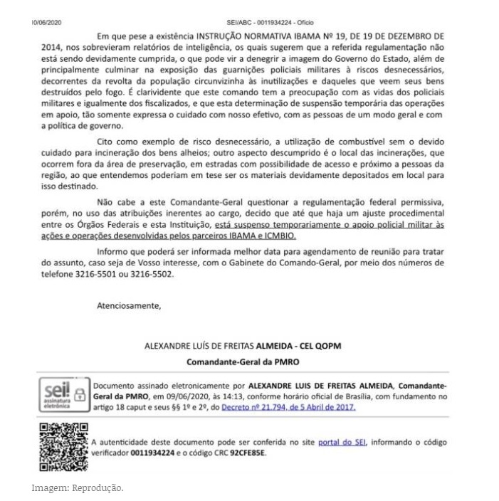 O texto assinado pelo comandante-geral da Polícia Militar de Rondônia, coronel Alexandre Luís de Freitas Almeida, afirma que a PM não participará das ações até que seja revista a norma que permite a queima de maquinários que estão sendo usados em crimes ambientais. A PM alega que a queima de maquinário se choca com a política de Governo de Rondônia.
