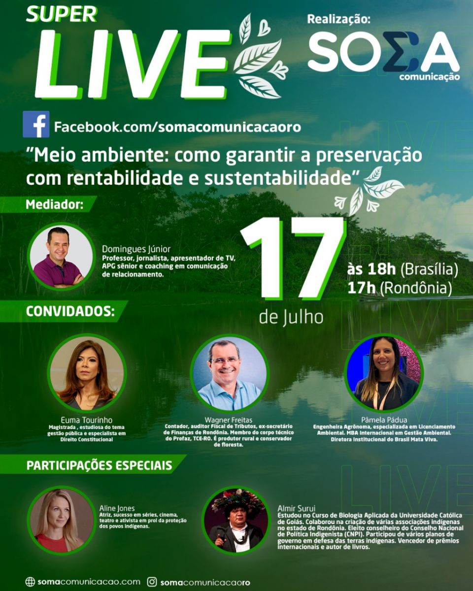 Todo mundo sabe que preservar a natureza e seus recursos naturais é fundamental para o equilíbrio de toda a vida no planeta. Apesar de ser uma realidade, o desmatamento das florestas ainda é um dos principais problemas enfrentados no mundo e, não obstante, na América do Sul e no Brasil, local onde está localizada a Floresta Amazônica. Mas como a população pode preservar as matas e ainda ter rentabilidade com isso? É justamente esse o tema da Super Live “Meio ambiente: como garantir a preservação com rentabilidade e sustentabilidade”, que será realizada pela Soma Comunicação na próxima sexta-feira (17), às 17h (local), pelo Facebook: /somacomunicacaoro.