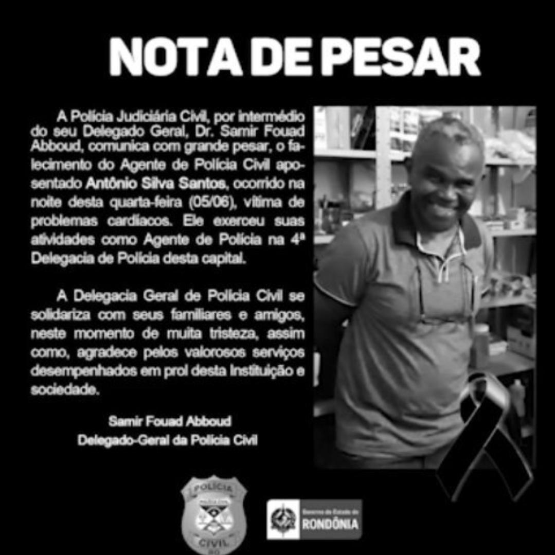 A Polícia Civil, por intermédio do seu Delegado Geral, Dr. Samir Fouad Abboud, comunica com grande pesar, o falecimento do agente de Polícia Civil aposentado Antônio Silva Santos, ocorrido na noite desta quarta-feira (05), vítima de problemas cardíacos.