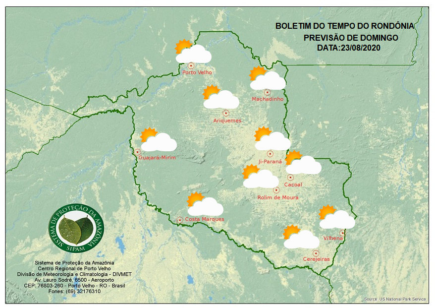 A Divisão de Meteorologia do Sistema de Proteção da Amazônia (Sipam) informa que o domingo (23) será de céu variando de parcialmente nublado a claro e não há previsão de chuvas. Pela manhã as temperaturas continuam amenas e a tarde voltam a se elevar.