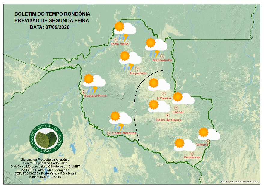 A semana começa com o aumento da umidade sobre o norte e oeste de Rondônia, devido o fluxo de umidade vinda do Amazonas, que favorece a organização de nuvens carregadas. Com isso, a previsão é de um dia de céu claro a parcialmente nublado, com pancadas isoladas de chuva e trovoadas entre a tarde e a noite na capital, no norte do estado, no Vale do Jamari e no Vale do Guaporé. Nas demais regiões de Rondônia o tempo também varia de claro a parcialmente nublado, mas sem previsão de chuva.
