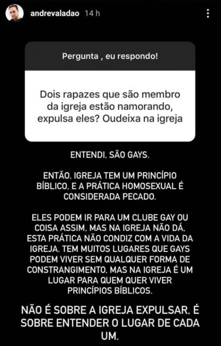 Para o pastor evangélico e cantor gospel André Valadão, homossexuais não devem frequentar a igreja. Segundo o líder da Igreja Batista da Lagoinha, "cada um (gay e cristão) deve saber o seu lugar". A afirmação foi feita nessa terça-feira (8) no Instagram, gerando críticas e polêmicas.