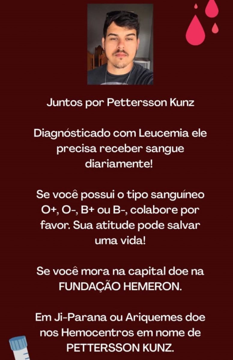 O jovem morador da cidade de Ouro Preto do Oeste (RO), Petterson Kunz de Souza, de 24 anos, está internado no Hospital do Amor em Porto Velho, após ter sido diagnosticado com leucemia.