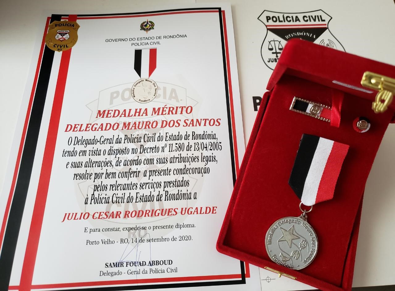 Na última sexta-feira (25/09), o Professor e Delegado Civil, Júlio Cesar Rodrigues Ugalde, que atua no curso de Direito da UNIRON, foi condecorado com a medalha de honra ao mérito 'Delegado Mauro dos Santos', pelos relevantes serviços prestados à Polícia Civil do Estado de Rondônia. A cerimônia de entrega da medalha ocorreu no auditório da Academia de Polícia Civil (Acadepol), em Porto Velho, e foi conduzida pelo Delegado Geral Samir Fouad Abboud.