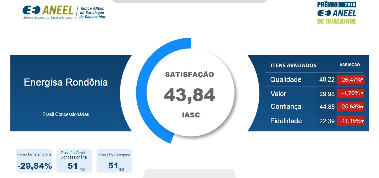 Elaborado pela Agência Nacional de Energia Elétrica – ANEEL, o índice de avaliação popular das concessionárias do serviço de distribuição de energia elétrica em todo o país, apontou que a Energisa Rondônia conta com 43,84% de satisfação por parte de seus clientes.