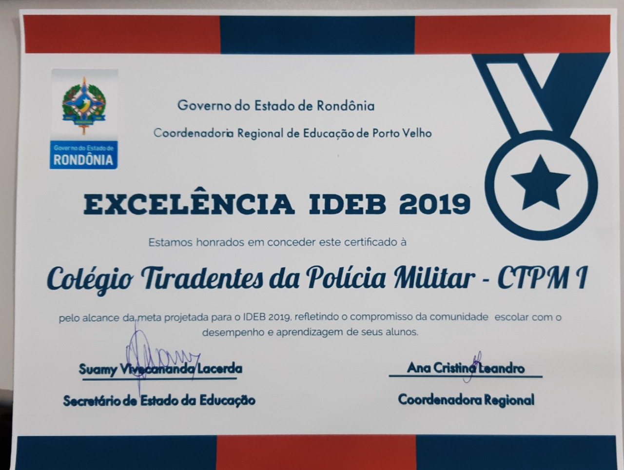 O Colégio Tiradentes da Polícia Militar de Rondônia recebeu o certificado de Excelência Ideb/2019, por ter ficado em 1° lugar do Estado nos três segmentos: Ensino Fundamental I e II e Médio.