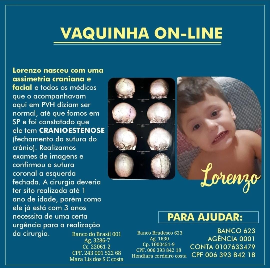 Lorenzo Souza Costa, de 03 anos, nasceu com Crânioestenose, uma deformidade progressiva que atinge a cabeça do bebê. Segundo os pais da criança, Marcos e Hendiara, o pequeno Lorenzo já deveria ter passado por cirurgia entre os 04 meses e um ano de idade.