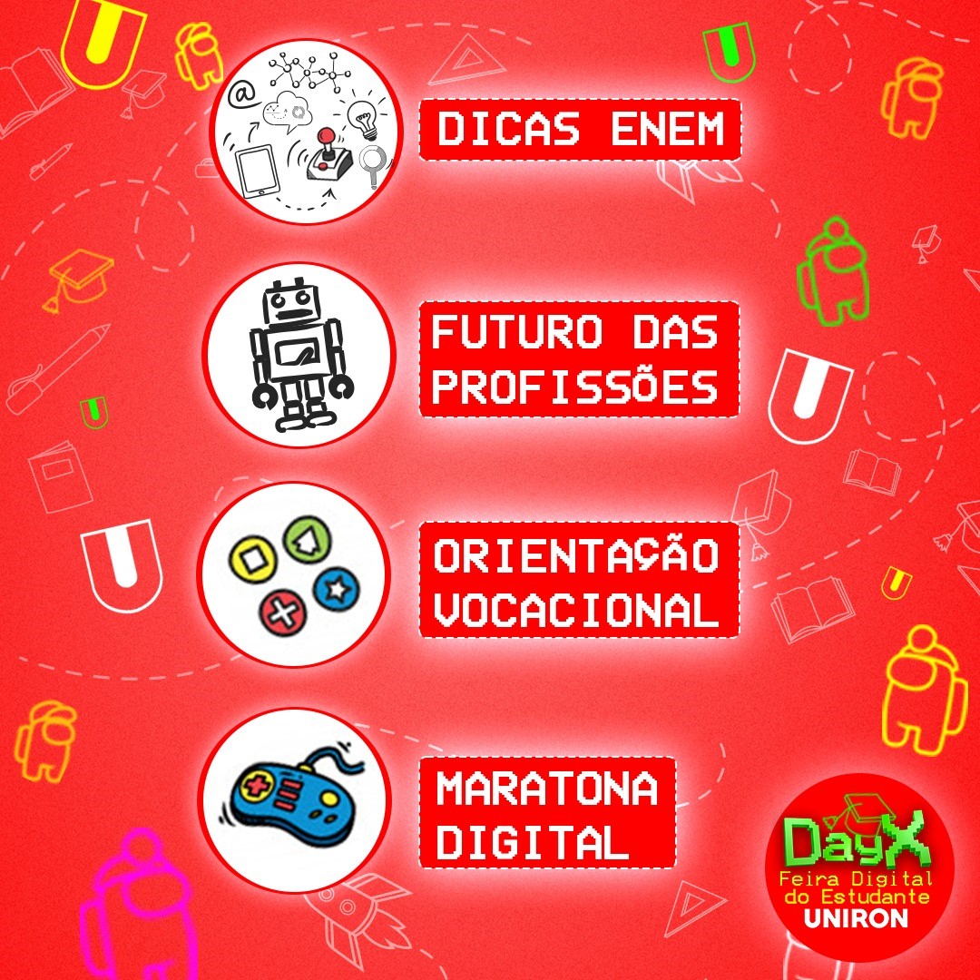 A UNIRON, realizará no dia 12 de dezembro o Day X – Feira do Estudante, das 14h às 18h. Este evento tem como objetivo a interação com alunos egressos do ensino médio. A programação contará com dicas para o Enem, interação com profissionais de diversas áreas falando sobre o futuro das profissões e esclarecendo dúvidas, dicas de mercado de trabalho e as transformações no mundo digital, orientação vocacional e a Maratona Digital.