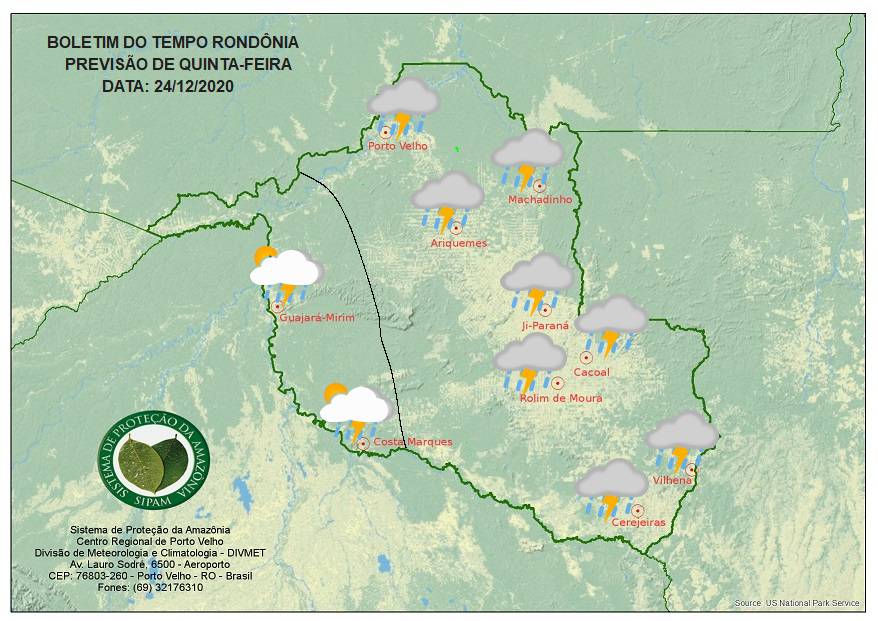 Entre a noite do dia 24 e a madrugada do dia 25 há possibilidade de chuva nas cidades do Vale do Guaporé, na região da capital, do Vale do Jamari, e das cidades ao longo do eixo das BR's 421 e 429.