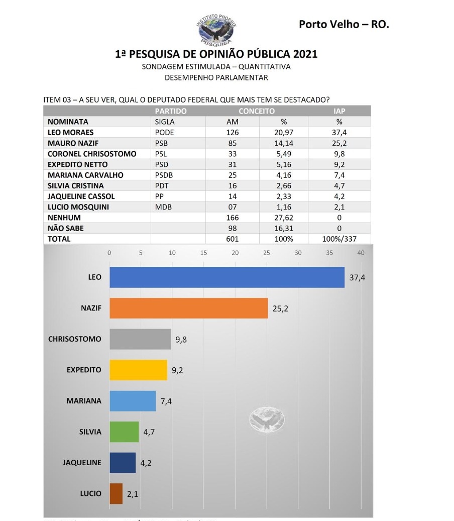 Segundo o levantamento, Léo Moraes (Podemos) é o deputado federal de nosso Estado que mais tem se destacado. Ele está disparado na frente dos demais com 37,4% de apoio dos eleitores. Em segundo lugar está o deputado federal Mauro Nazif (PSB), com 25,2%. Já em terceiro, aparece o deputado Cel. Chrisóstomo (9,8%).