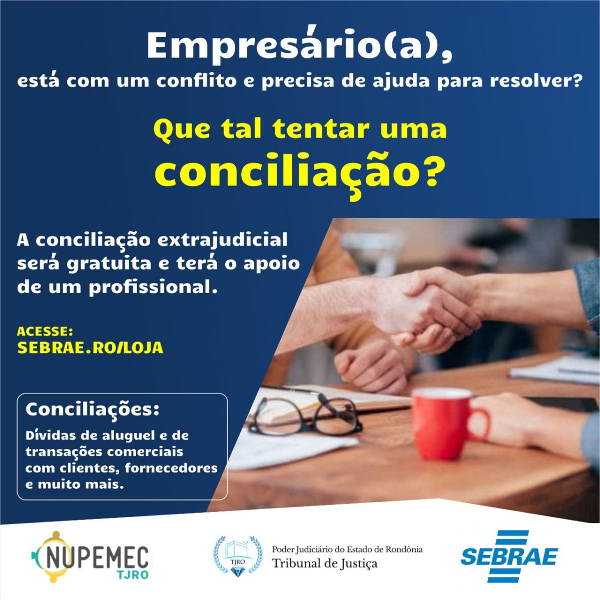 Ao longo do segundo semestre de 2020 o NUPEMEC, atuando com o Sebrae em Rondônia, visualizou que a situação de emergência causada pela pandemia geraria eventuais inadimplências e conflitos no meio empresarial para estabelecerem estratégias com objetivo de ampliar a oferta de audiências de conciliação no território rondoniense.