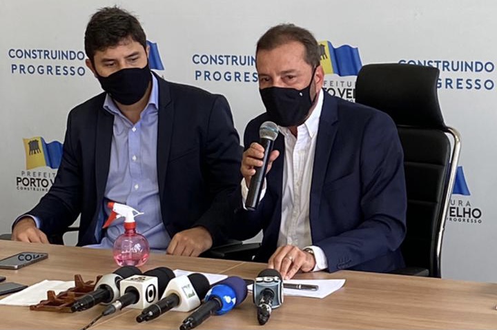 Prefeito Hildon Chaves e vice Maurício Carvalho em coletiva neste sábado. Foto: Assessoria