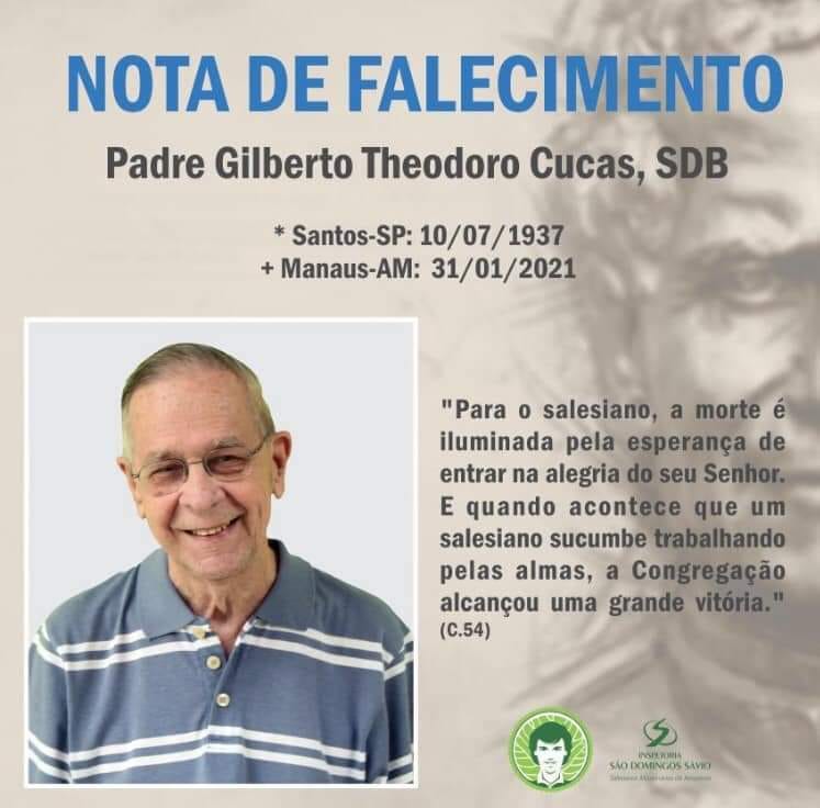 O padre salesiano Gilberto Theodoro Cucas, que já exerceu a direção do antigo Colégio Dom Bosco, em Porto Velho, faleceu, neste domingo (31), na cidade de Manaus, no Amazonas, onde estava morando nos últimos anos. Em Porto Velho exerceu o sacerdócio de forma exemplar.