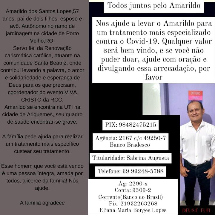 Familiares e amigos de Amarildo dos Santos Lopes, 57 anos, estão unidos em uma corrente de apoio a ele, que contraiu covid-19 e se encontra internado em estado grave na UTI, em Ariquemes. Atualmente, se encontra com 75% dos pulmões comprometidos.