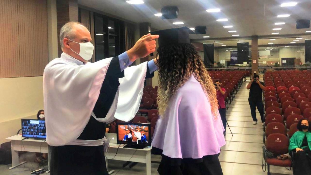 A tecnologia permitiu, por exemplo, que o diretor geral da UNESC, Ronald Campos, conduzisse as solenidades de colação de grau dos formandos das unidades de Vilhena e Porto Velho, diretamente da unidade de Cacoal. A transmissão foi organizada de forma que os acadêmicos se reuniram em um ambiente virtual, por meio da plataforma Google Meet, e interagiam com aqueles que, presencialmente, conduziam e participaram das cerimônias. No auditório da UNESC em Cacoal, além da direção da Instituição, participaram apenas os coordenadores dos cursos da unidade e os representantes das turmas.