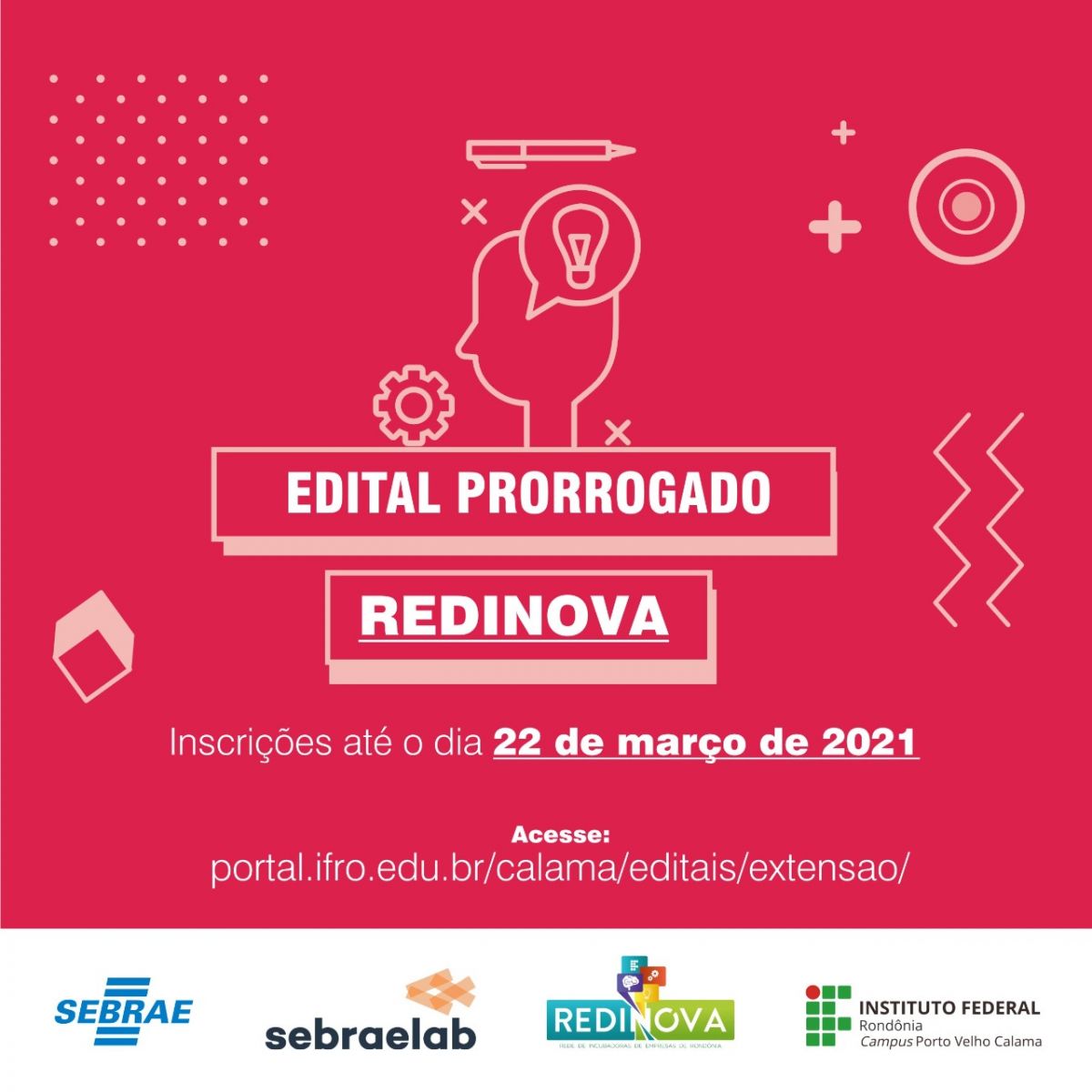 Foram prorrogadas até o dia 22 de março, as inscrições para o Programa de Desenvolvimento de Negócios por meio do Núcleo Incubador de Empresas, vinculado à Rede de Incubadoras de Empresas de Rondônia – REDINOVA, ação do Instituto Federal de Rondônia - IFRO em parceria com o Sebrae Rondônia através do Hub de Inovação Sebraelab.