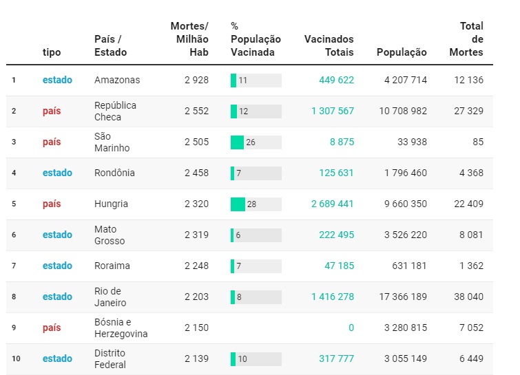 Nesse ranking, o estado de Rondônia ocupa a assustadora quarta posição com um registro de 2.458 mortes por cada milhão. Ou seja, se o estado de Rondônia fosse um país, seria o quarto em morte por COVID-19 no mundo.