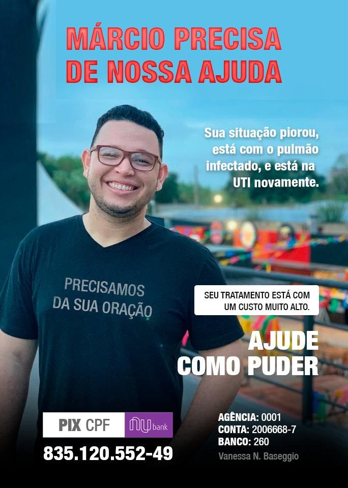 Os familiares e amigos de Márcio Damião Miranda Nascimento, 32 anos, estão se mobilizando para arrecadar recursos a serem utilizados nas despesas hospitalares dele. Ele está internado desde o último dia 17 de abril, em um hospital de Porto Velho, lutando contra a covid-19.