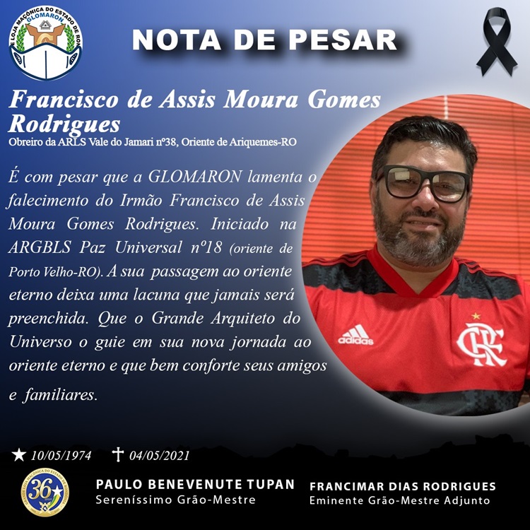 A Loja Maçônica Glomaron enviou uma nota de pesar pela morte de Francisco Rodrigues. Veja o texto: