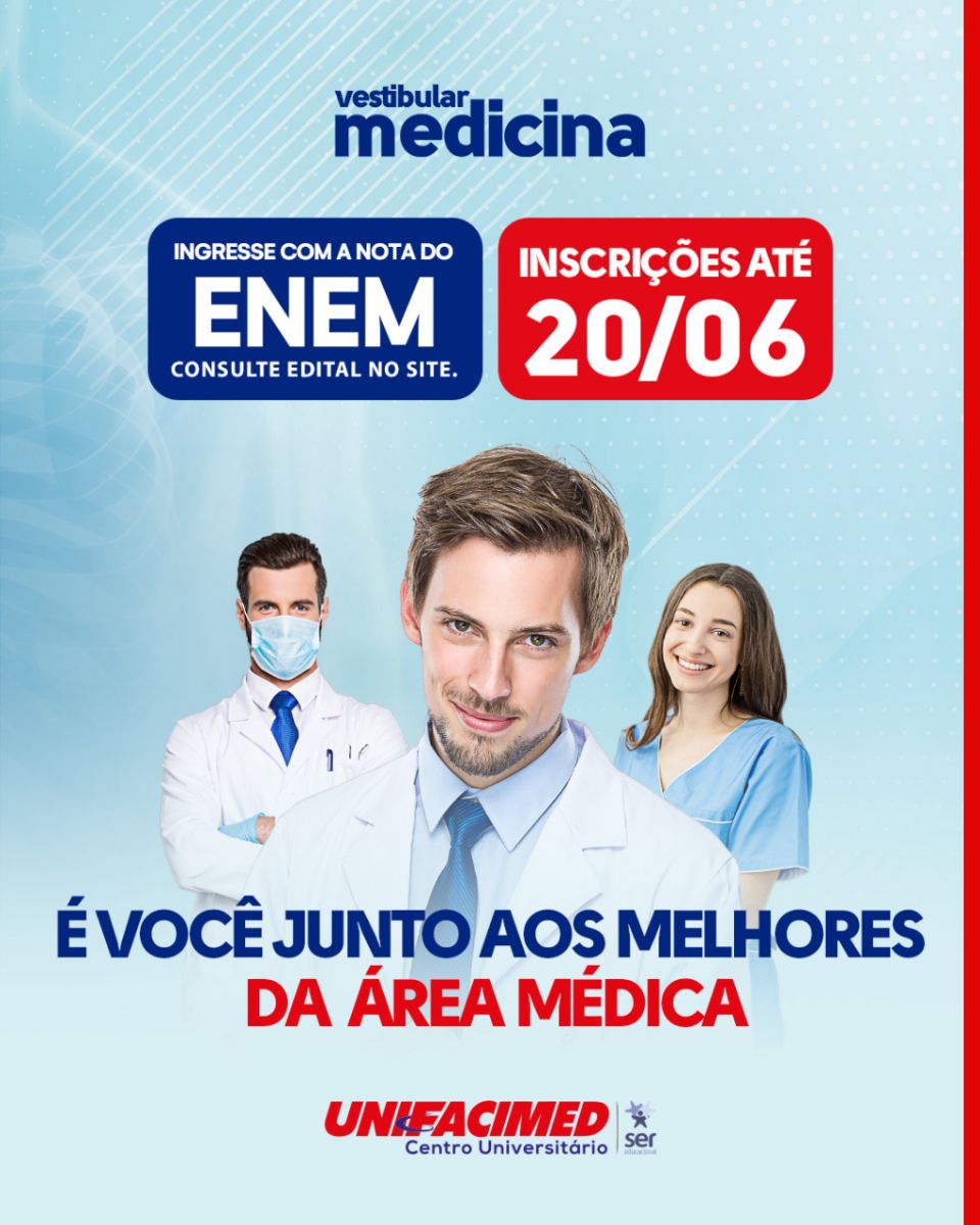 Estão abertas as inscrições para o vestibular de Medicina do Centro Universitário UNIFACIMED. Devido às restrições impostas pela pandemia do novo coronavírus, o processo seletivo acontece por meio da nota do Exame Nacional do Ensino Médio (Enem) e pode ser realizado até o dia 20 de junho, exclusivamente no site