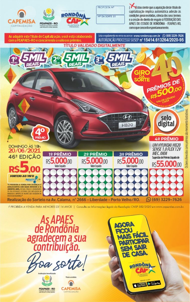 O RondônCap preparou um arraiá de prêmios para você ajudar as APAES e concorrer a cada um deles. Tem um carro zero km, 43 prêmios em dinheiro e o título só 5 reais! Já no quarto prêmio tem um HB20 no valor de 55.000 reais, e ainda tem 5.000 no terceiro, segundo e primeiros prêmios e 40 giros da sorte de 500 reais cada!
