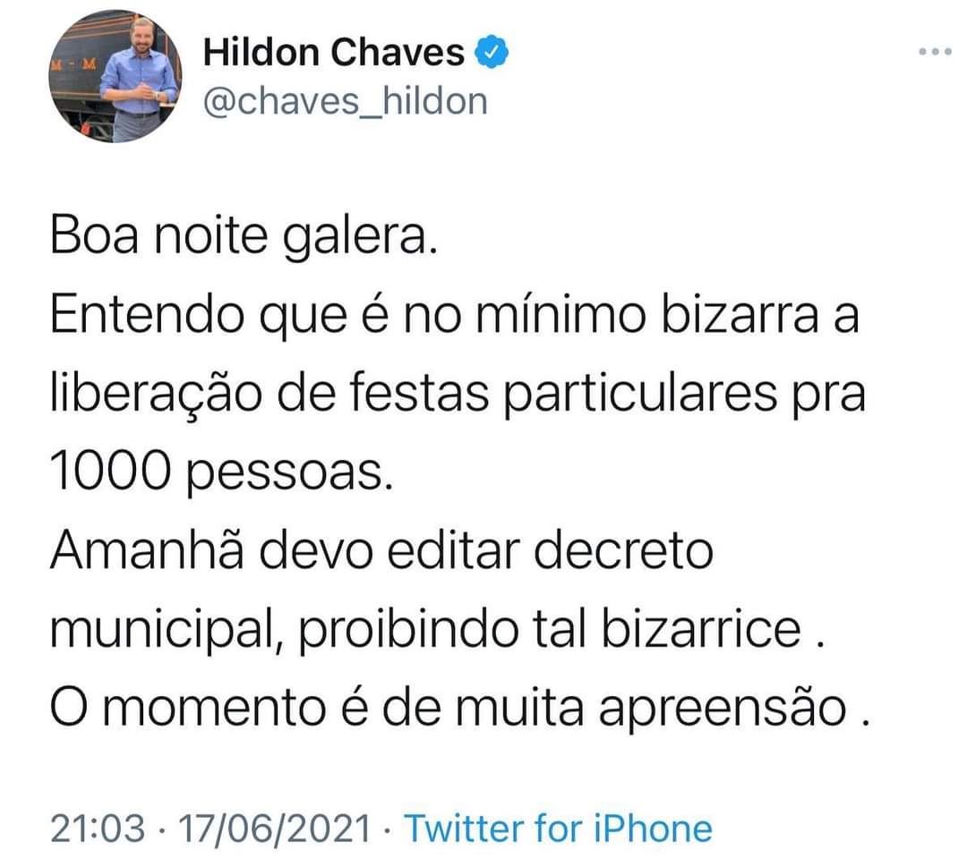 “Entendo que seja no mínimo bizarra a liberação de festas particulares para 1000 pessoas. Amanhã devo editar decreto municipal proibindo tal bizarrice. O momento é de muita apreensão”, afirmou Hildon Chaves.