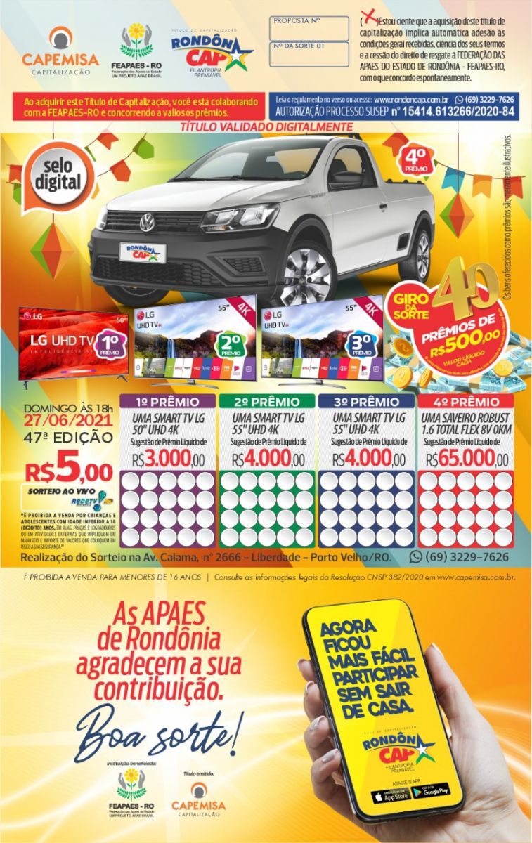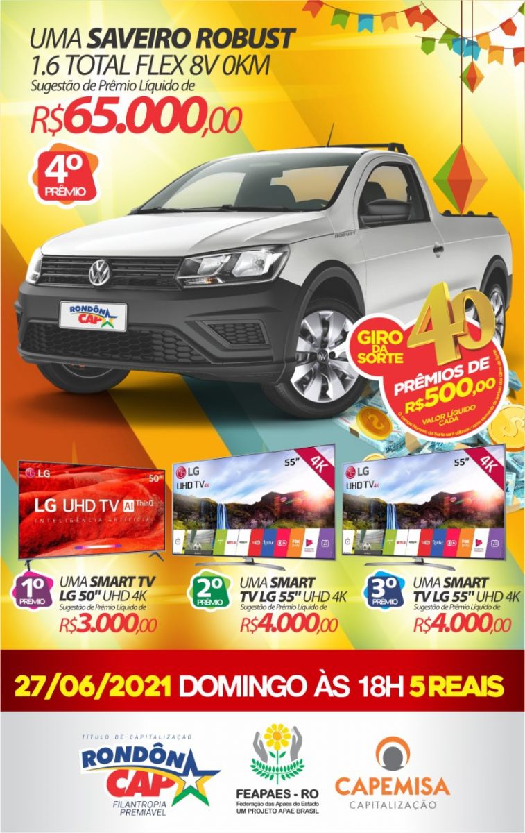 Na semana do São João, o Rondoncap trás uma festança de premiação. Tem Pick-up novinha, três Smart Tvs tela grande, 40 giros da sorte e o título é só R$ 5 reais.