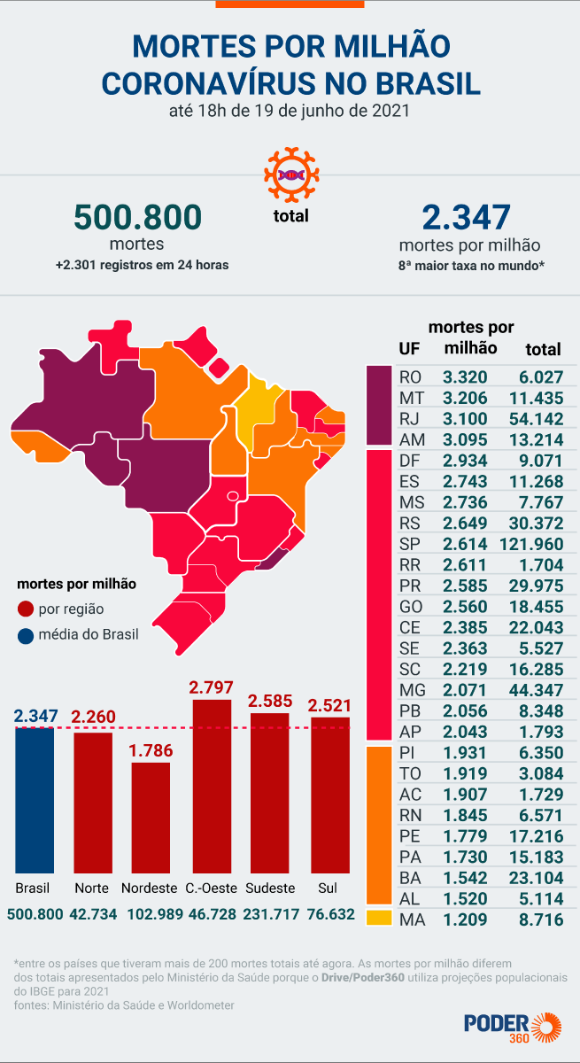 Os dados apontam que neste último sábado (19) Rondônia chegou à marca de 3.320 mortes por milhão de habitantes, um número que fica bem acima da média brasileira, que é de 2.347.  O brasil é o oitavo país nessa fúnebre lista.