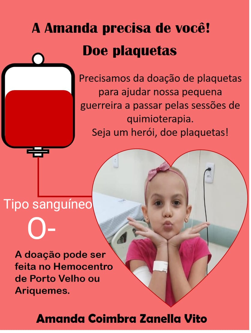 Diante desse quadro, familiares e amigos estão lutando para conseguir doações de plaquetas, para que ela consiga fazer as sessões de quimioterapia. Amanda necessita de transfusões do tipo sanguíneo dela, que é O- (O negativo).