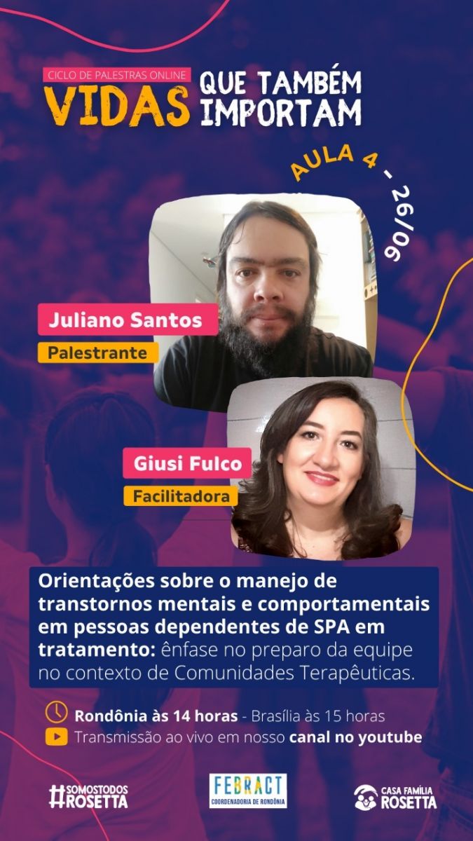 Neste sábado (26), às 14.00 horas, a Casa Família Rosetta e Coordenadoria Regional FEBRACT Rondônia irão realizar mais uma palestra formativa com o tema “Orientações sobre o manejo de transtornos mentais e comportamentais em pessoas dependentes de SPA em tratamento: ênfase no preparo da equipe no contexto de Comunidades Terapêuticas “