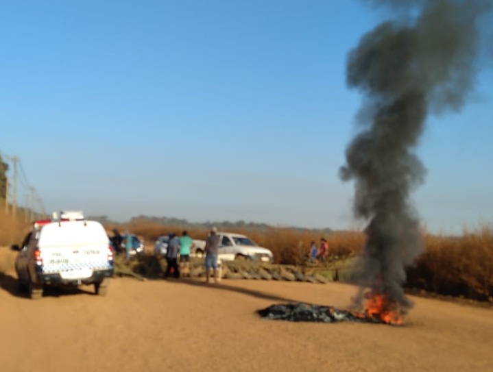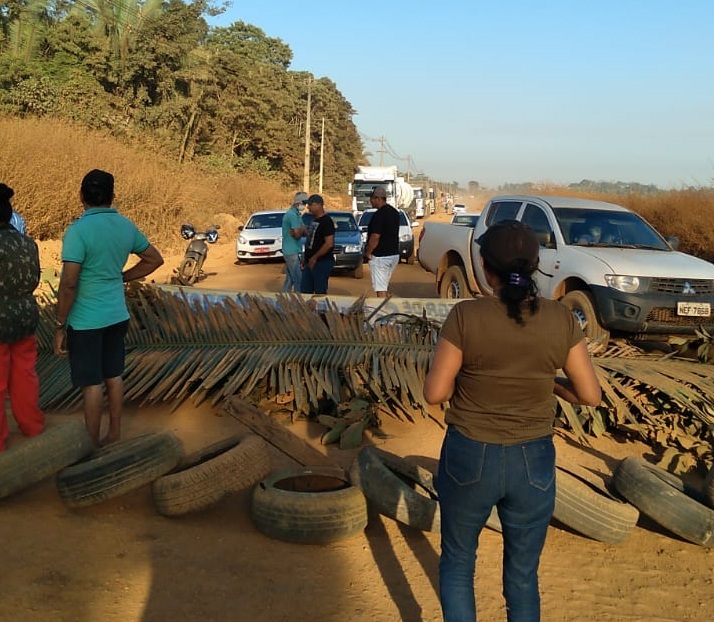 Com pneus e toras de madeira incendiados a comunidade exige que o governador Marcos Rocha (SEM PARTIDO) conclua o serviço de asfaltamento da estrada que vem se arrastando há mais de quatro anos.