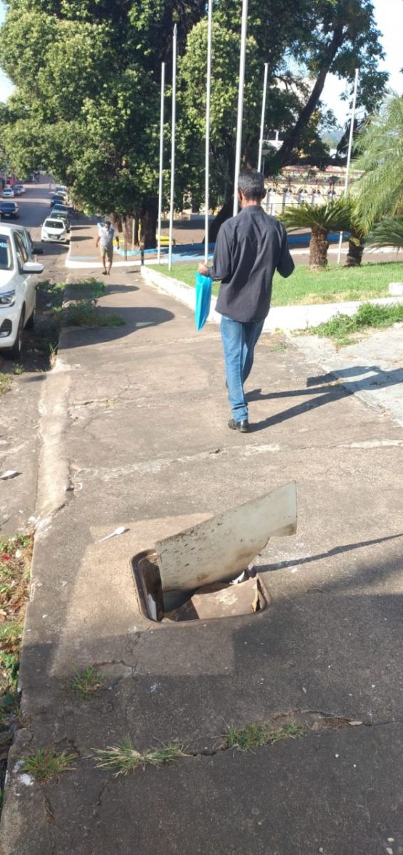 Situação semelhante ocorre na calçada do antigo Palácio Getúlio Vargas, que foi sede do Governo de Rondônia. Um bueiro sem tampa e com pedaços de madeiras avisa aos transeuntes para ter cuidado ao passar pelo local.