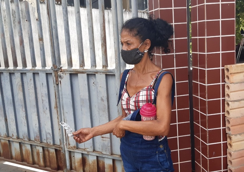 Nas mãos, Sandra carrega um envelope com remédio para pneumonia. Já são quatro meses tomando o medicamento, doado pela prefeitura, e que ainda não lhe curou totalmente.