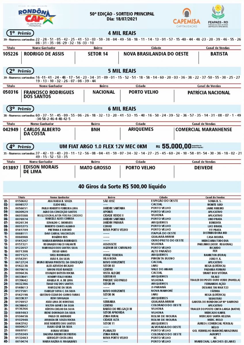 O Rondoncap continua levando sorte e solidariedade a todo estado. No sorteio do último domingo, 18, não foi diferente.