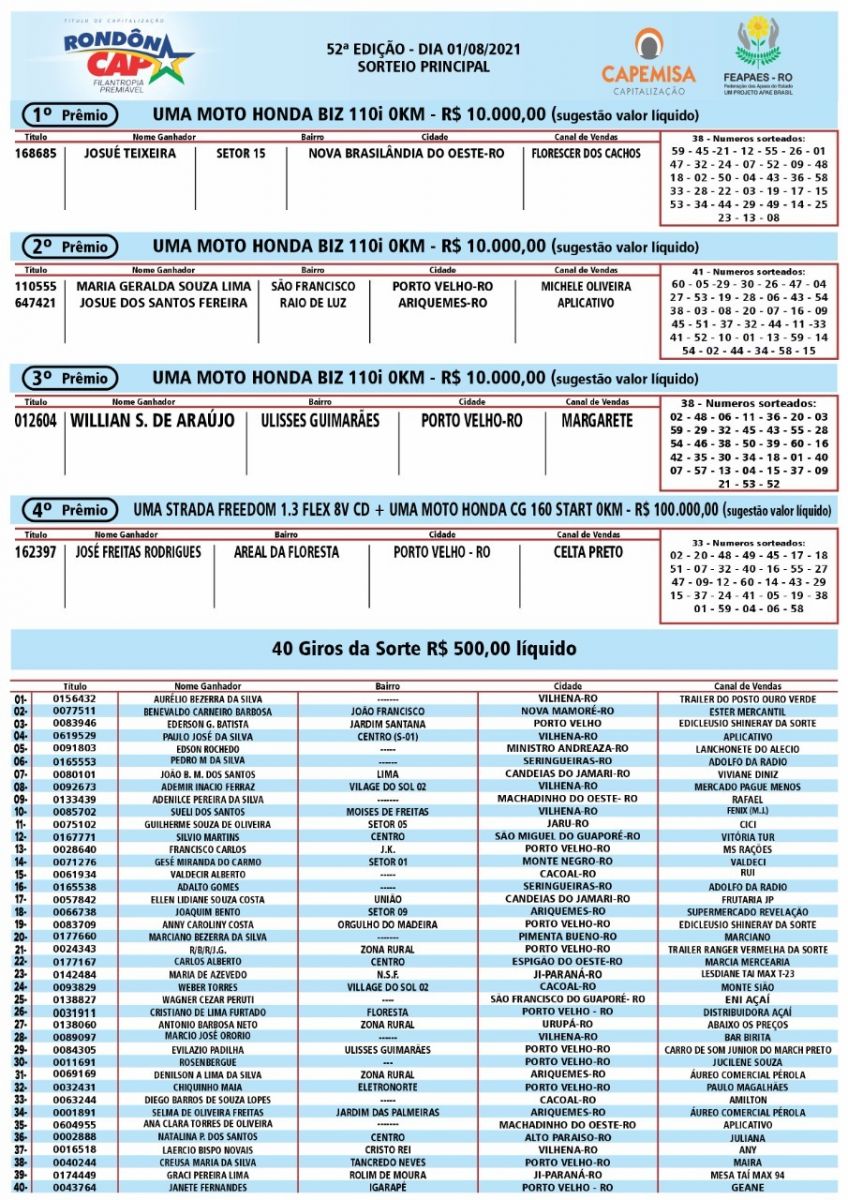 Quem ganha no Rondoncap todo mundo vê, conheça agora os ganhadores do último domingo, 01 de agosto de 2021.