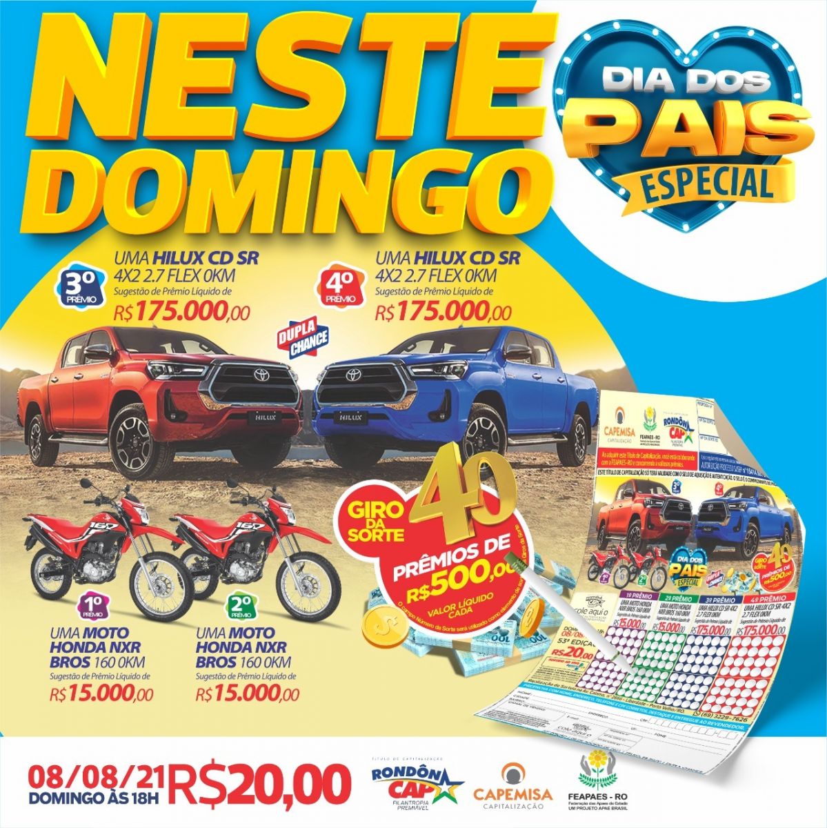 Se o dia dos pais é especial, o sorteio do Rondoncap não vai ser diferente. No próximo domingo tem duas caminhonetes zero quilômetro e não é qualquer caminhonete não, são duas Toyota Hilux no valor de 175 mil reais cada.