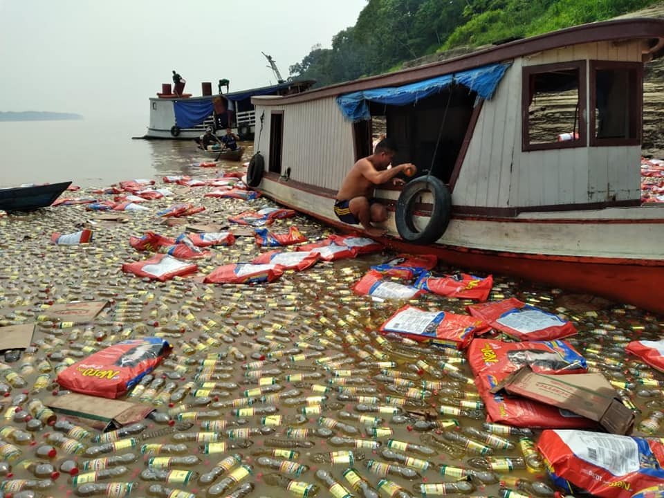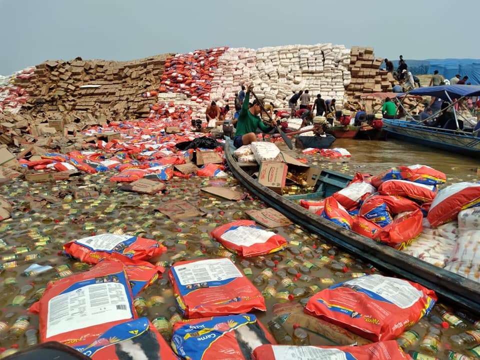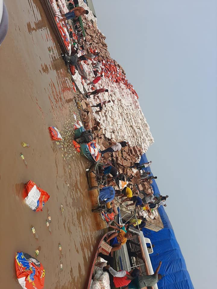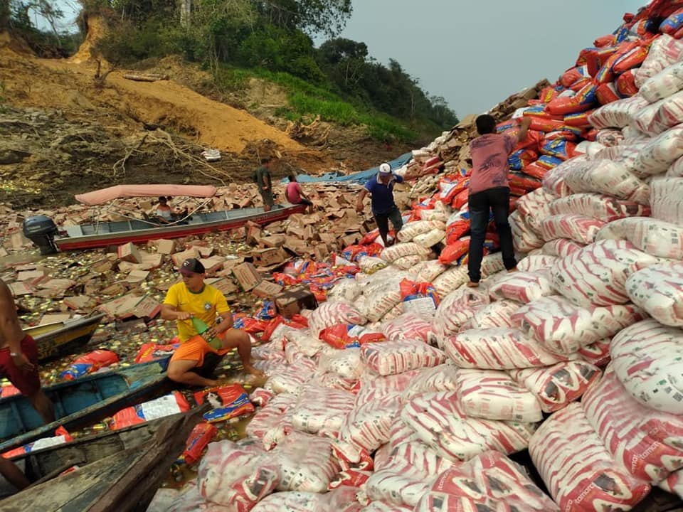 No vídeo, aparece pessoas pegando a carga que estava no rio. Várias canoas e outras embarcações provisórias estão sendo carregadas com os produtos que se espalharam pelo local.