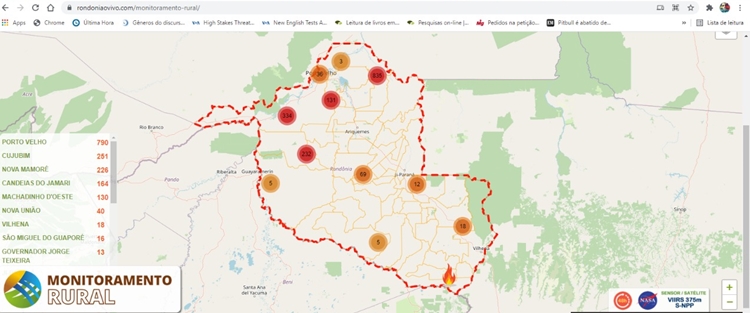 Somente na capital, nas primeiras horas desta terça-feira(10), foram registrados 790 pontos de incêndios, distribuídos em diferentes pontos do município. Sendo que a maior parte dos focos de fogo, em torno de 184, está localizada dentro da Terra Indígena Karipuna, que fica na área entre Porto Velho e a cidade de Nova Mamoré.