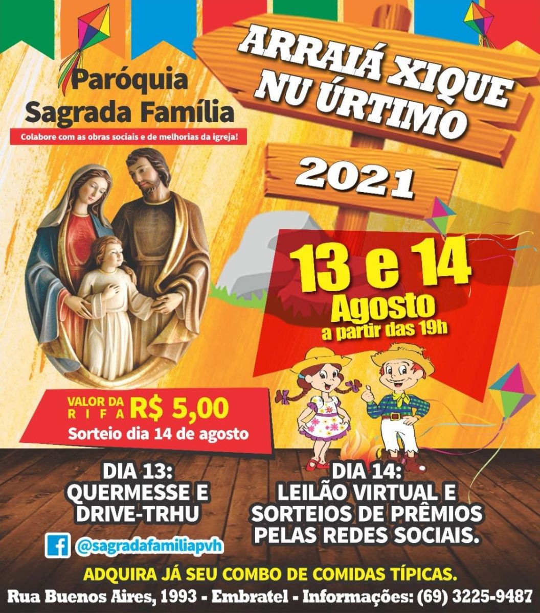 A Paróquia Sagrada Família vai promover o 'Arraiá Xique Nu Úrtimo', na modalidade drive-thru, oferecendo várias comidas típicas e muita diversão para os portovelhenses.