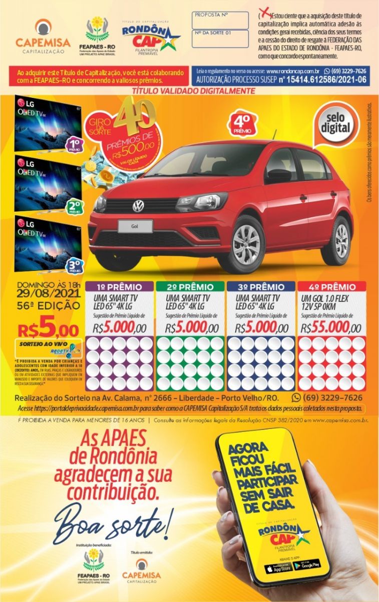 O Rondoncap do próximo domingo vai sortear o novo Gol 0 KM, 3 Smart-TVs tela grande, 40 giros da sorte e o título é só 5 reais. Só R$ 5 para você ajudar as Apaes de Rondônia e participar.