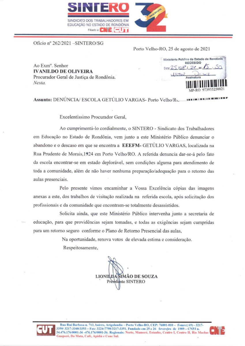 O Sintero protocolou denúncia ao Ministério Público do Estado de Rondônia (MP/RO), na última quarta-feira (25/08), relatando que a E.E.E.F.M Getúlio Vargas, localizada em Porto Velho, encontra-se em condições inadequadas para receber toda a comunidade escolar, tendo em vista os parâmetros estabelecidos no Plano de Retorno Presencial elaborado pela Secretaria de Estado de Educação (Seduc).