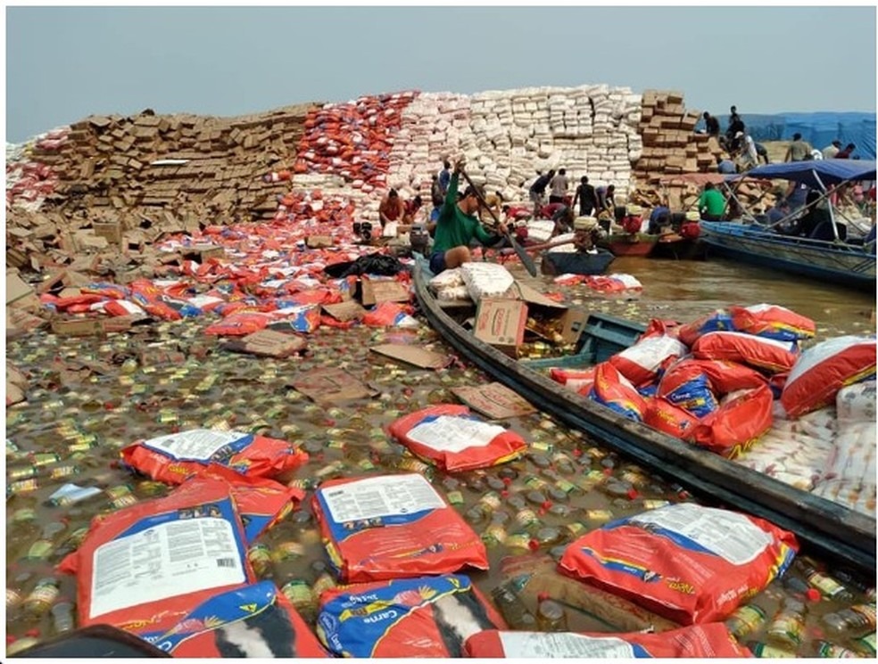 Recentemente, uma balsa carregada de alimentos virou no rio Madeira