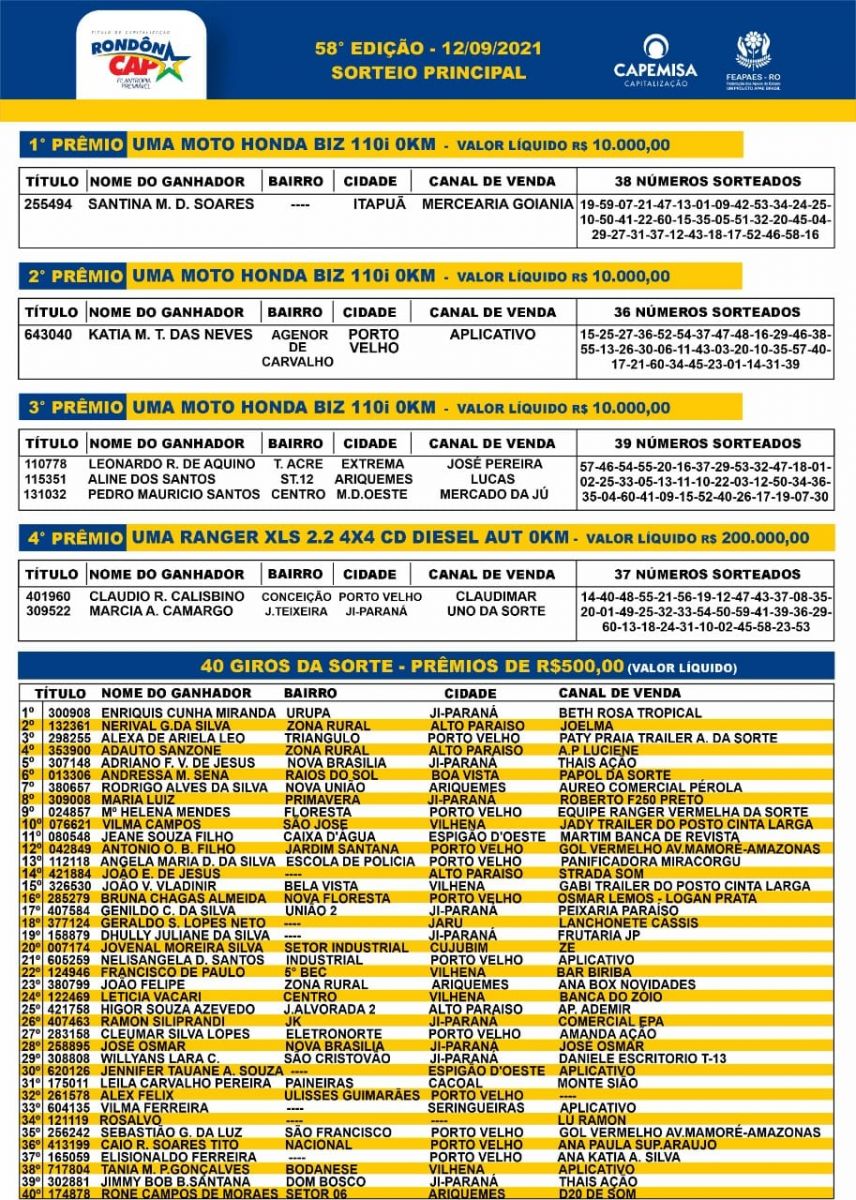 Confira o nome dos ganhadores do sorteio principal e giros da sorte: