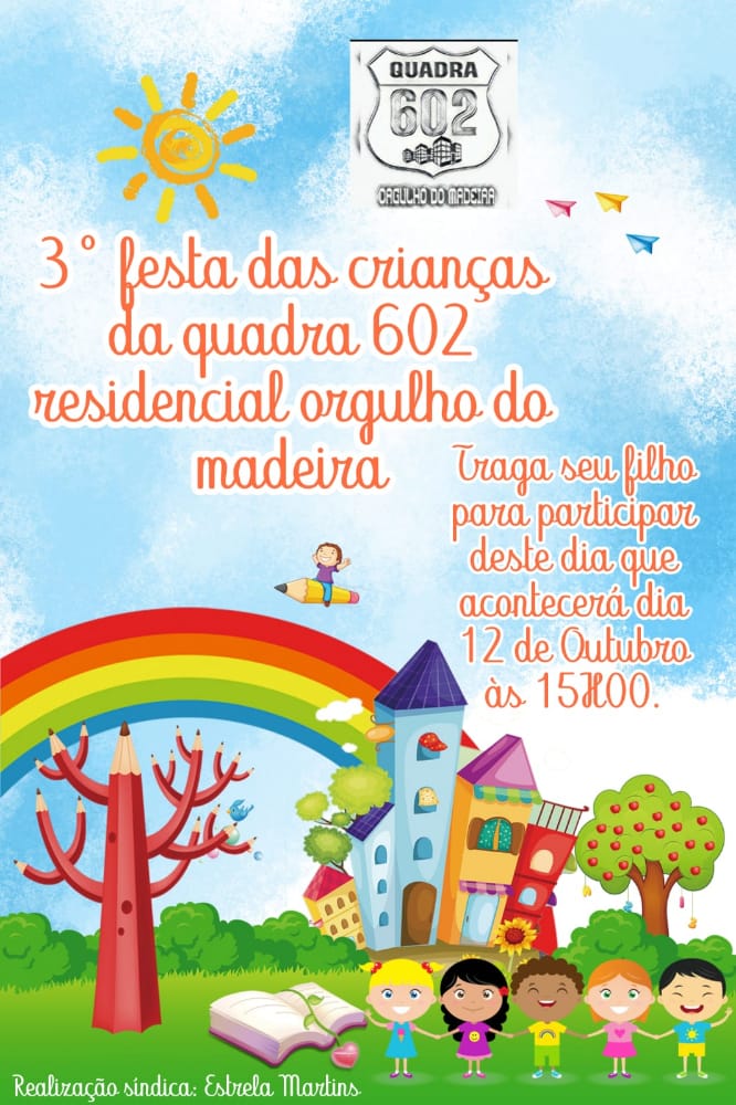 Essa ação é uma iniciativa da síndica Estrela Martins, seu esposo Rodolfo Costa e a equipe, com objetivo de realizar a 3ª festa das crianças da quadra 602. O evento irá acontecer no dia 12 de outubro, a partir das 15h.