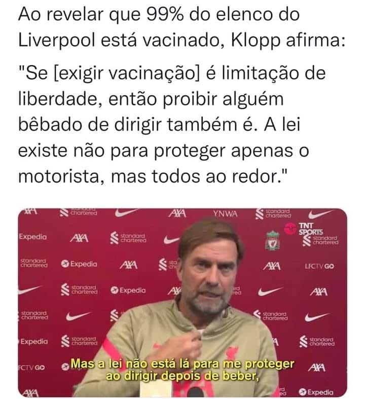 Para quem ainda acha que vacinação não salva e já que o Brasil é o país do futebol, na semana passada, o técnico Jürgen Klopp, do Liverpool (Inglaterra), deu uma declaração importante envolvendo vacinação e bebida ao volante, prática muito comum entre os brasileiros.